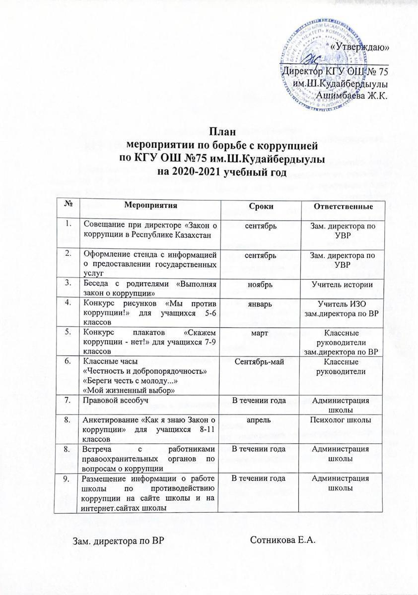 01 сентябрь 2020 0 1 2 3 4 5 План мероприятии по борьбе с коррупцией по КГУ ОШ №75 им.Ш.Кудайбердыулы на 2020-2021 учебный год Планмероприятии по борьбе с коррупциейпо КГУ ОШ №75 им.Ш.Кудайбердыулына 2020-2021 учебный год