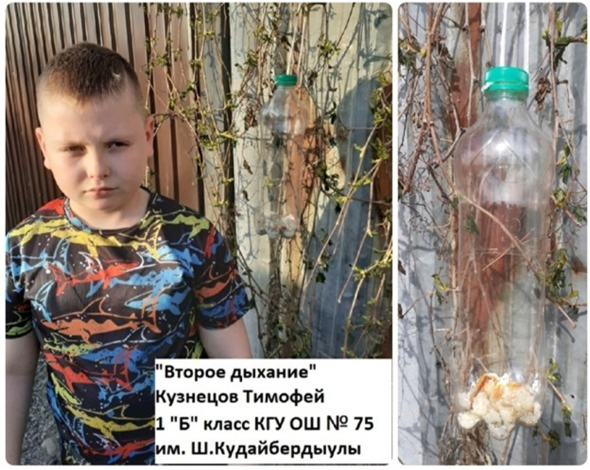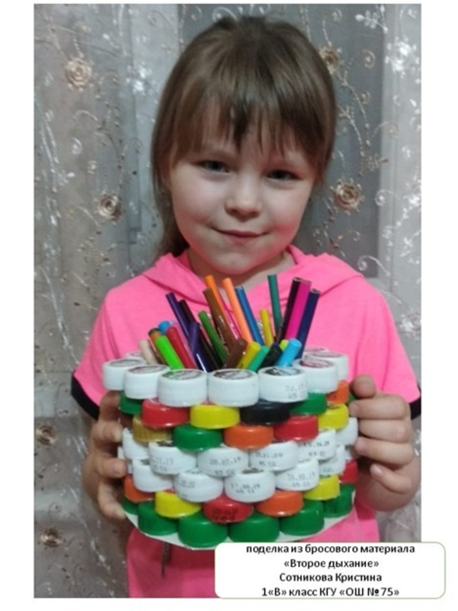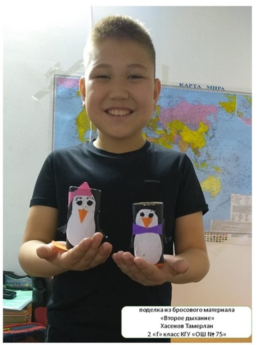 В рамках третьего дня (28 апреля) общереспубликанской Недели экологического образования в КГУ ОШ №75 им. Ш.Кудайбердыулы прошел Конкурс поделок из бросового материала «Второе дыхание» среди учащихся 1-4 классов.