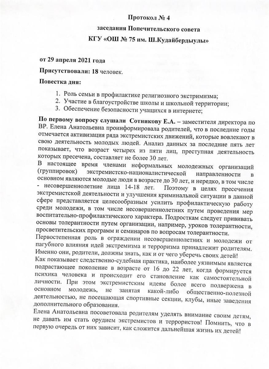 29 апрель 2021 0 1 2 3 4 5 Протокол №4 заседания Попечительского совета КГУ «ОШ № 75 им. Ш.Кудайбердыулы»