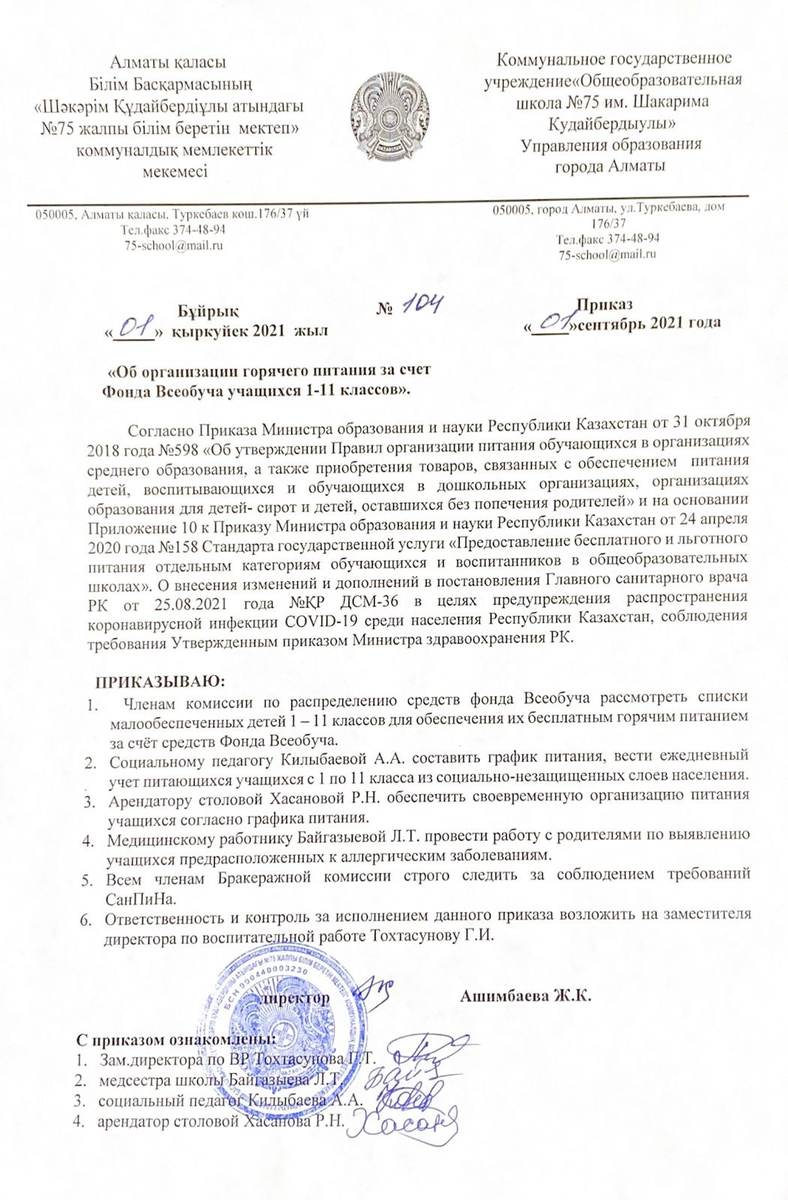01 сентябрь 2021 0 1 2 3 4 5 Об организации горячего питания за счет Фонда Всеобуча на 2021-2022 уч. год.