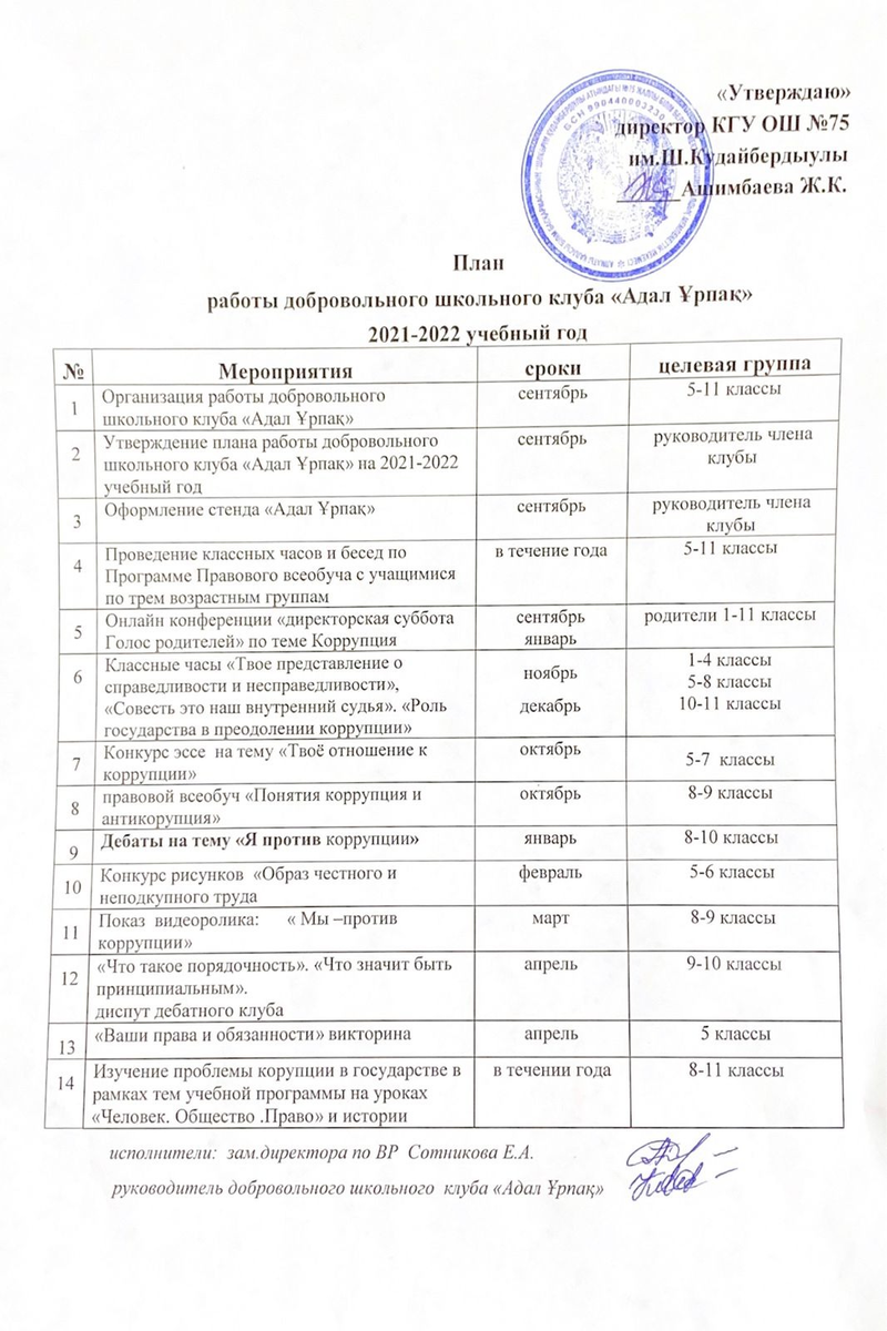 04 сентябрь 2021 0 1 2 3 4 5 ПЛАН Работы добровольного школьного клуба «Адал Ұрпақ» 2021-2022 учебный год