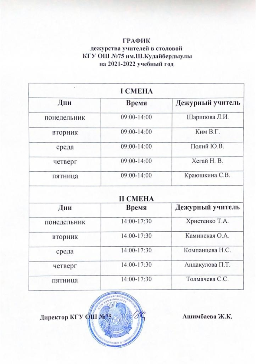 График дежурства учителей в столовой на 2021-2022 уч. год
