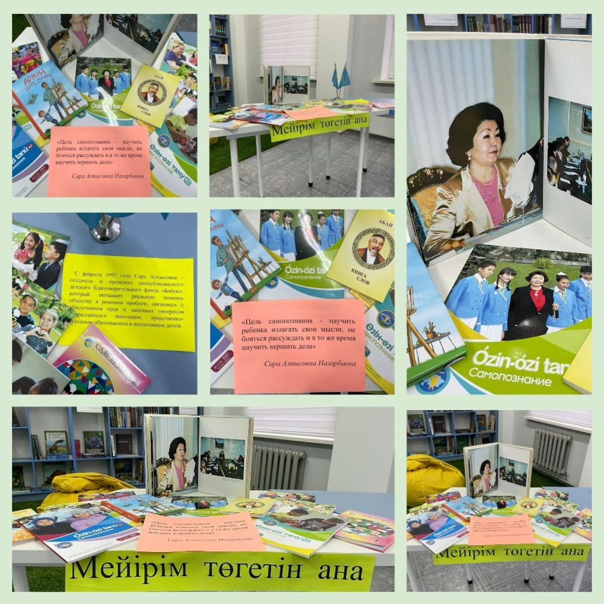 Книжная выставка «Мейірім төгетін ана» о деятельности автора программы нравственно-духовного образования «Самопознание» С.А. Назарбаевой.