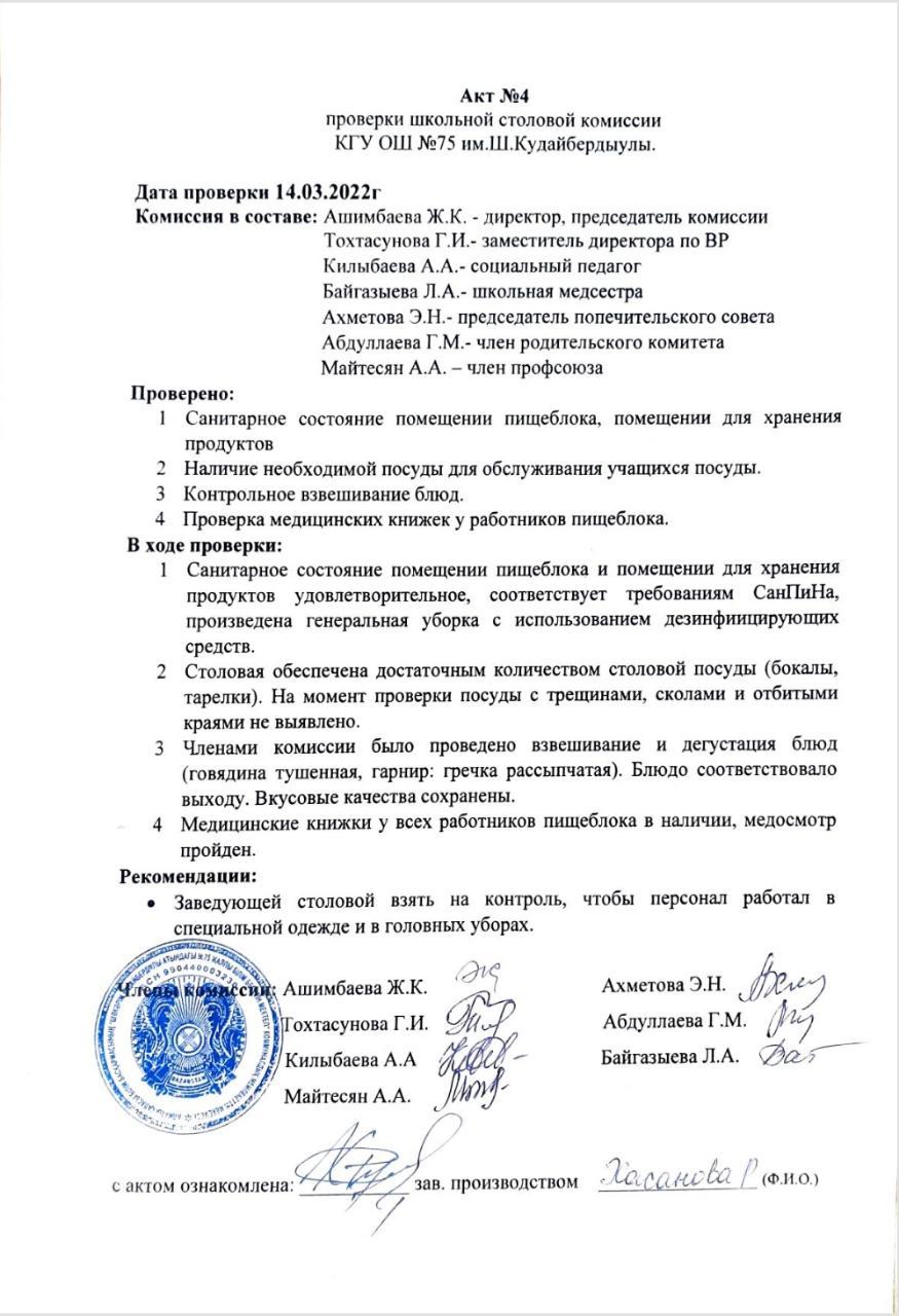 Акт №4 проверки школьной столовой