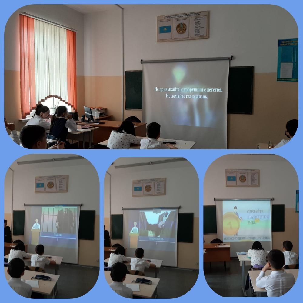 Согласно плану работы добровольного школьного клуба «Адал Ұрпақ» в КГУ ОШ № 75 им.Ш.Кудайбердыулы учащимся были продемонстрированы видеоролики, презентации на тему «Мы против коррупции». Целью проведения было сформировать у учащихся антикоррупционное мировоззрение и воспитать негативное отношение к коррупции.