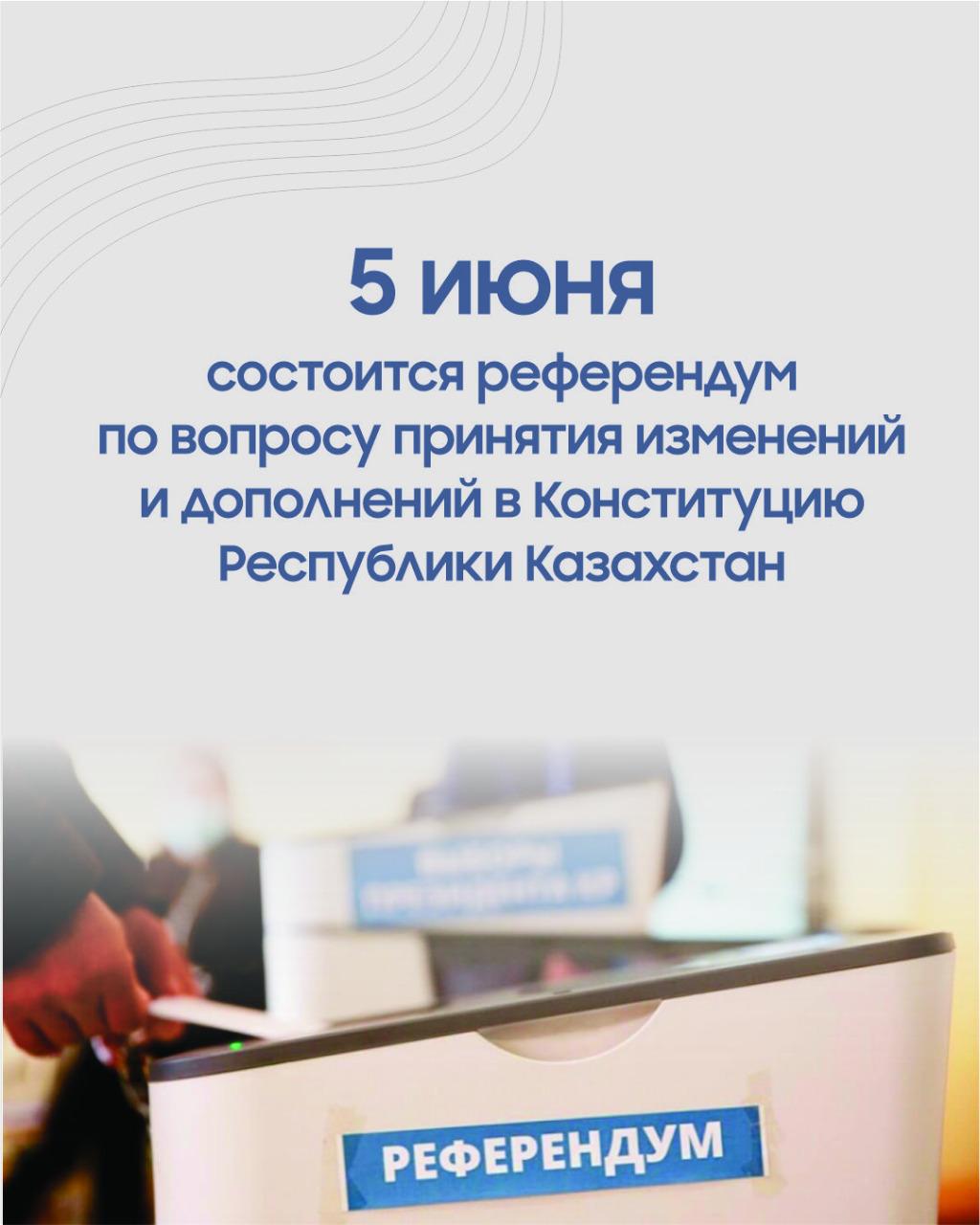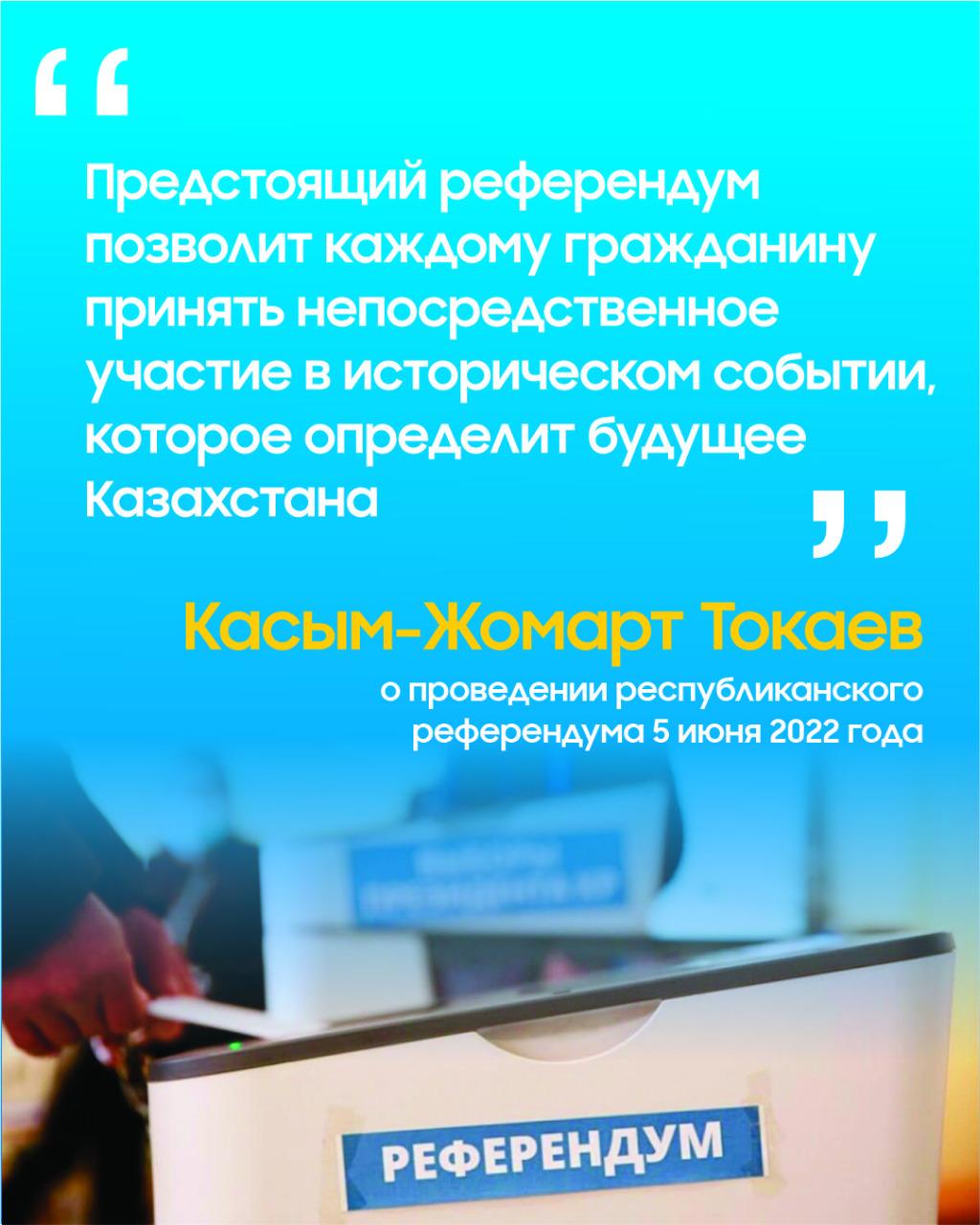 06 май 2022 0 1 2 3 4 5 5 июня - Республиканский референдум 5 июня грядёт важное социальное и политическое событие! Каждый совершеннолетний гражданин нашей Родины сможет принять участие в голосовании, тем самым внеся свой вклад в становление Нового Казахстана!