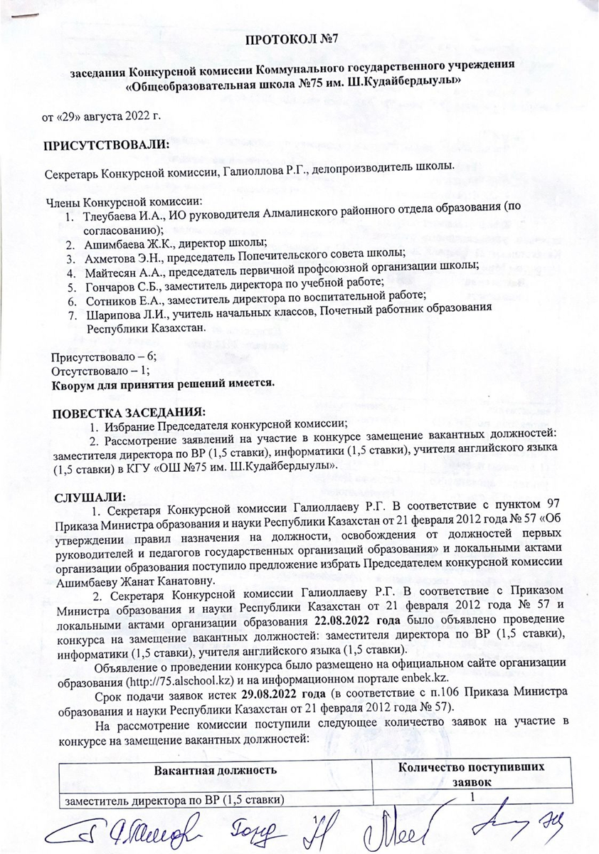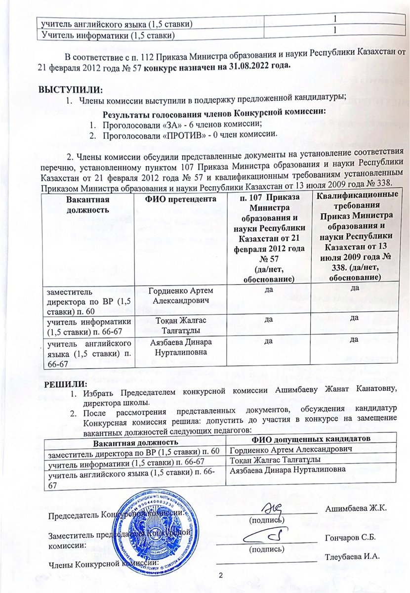 29 август 2022 0 1 2 3 4 5 Бос лауазымды орындарға орналасу конкурсына қатысуға рұқсат беру туралы хаттама / Протокол о допуске к участию в конкурсе на занятие вакантных должностей