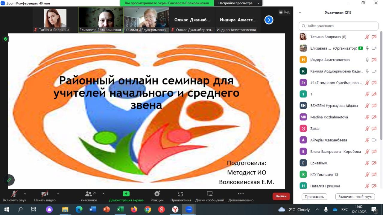 12 января 2023 г. Методистом инклюзивного образования Волковинской Е.М проведена онлайн семинар для учителей Алмалинского района города Алматы реализующих инклюзивную практику. Тема семинара: "Разработка урока в классе и методы обучения детей с ООП". НА семинаре участвовали более 50 педагогов Алмалинского района.