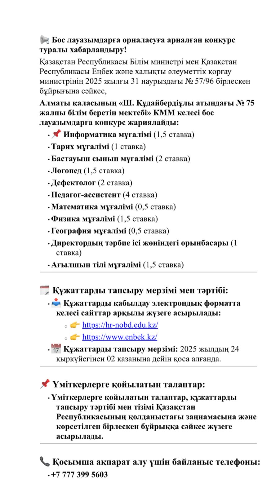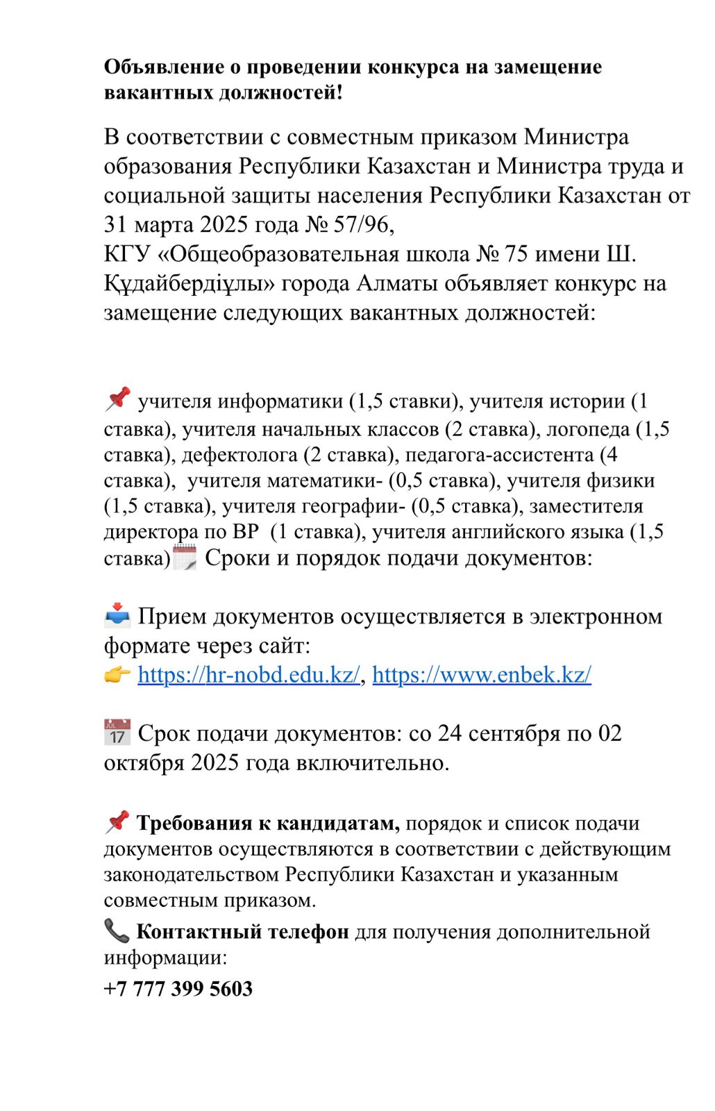 24 сентябрь 2025 0 1 2 3 4 5 Объявление о проведении конкурса на замещение вакантных должнестей! Бос лауазымдарға орналасуға арналған конкурс туралы хабарландыру!