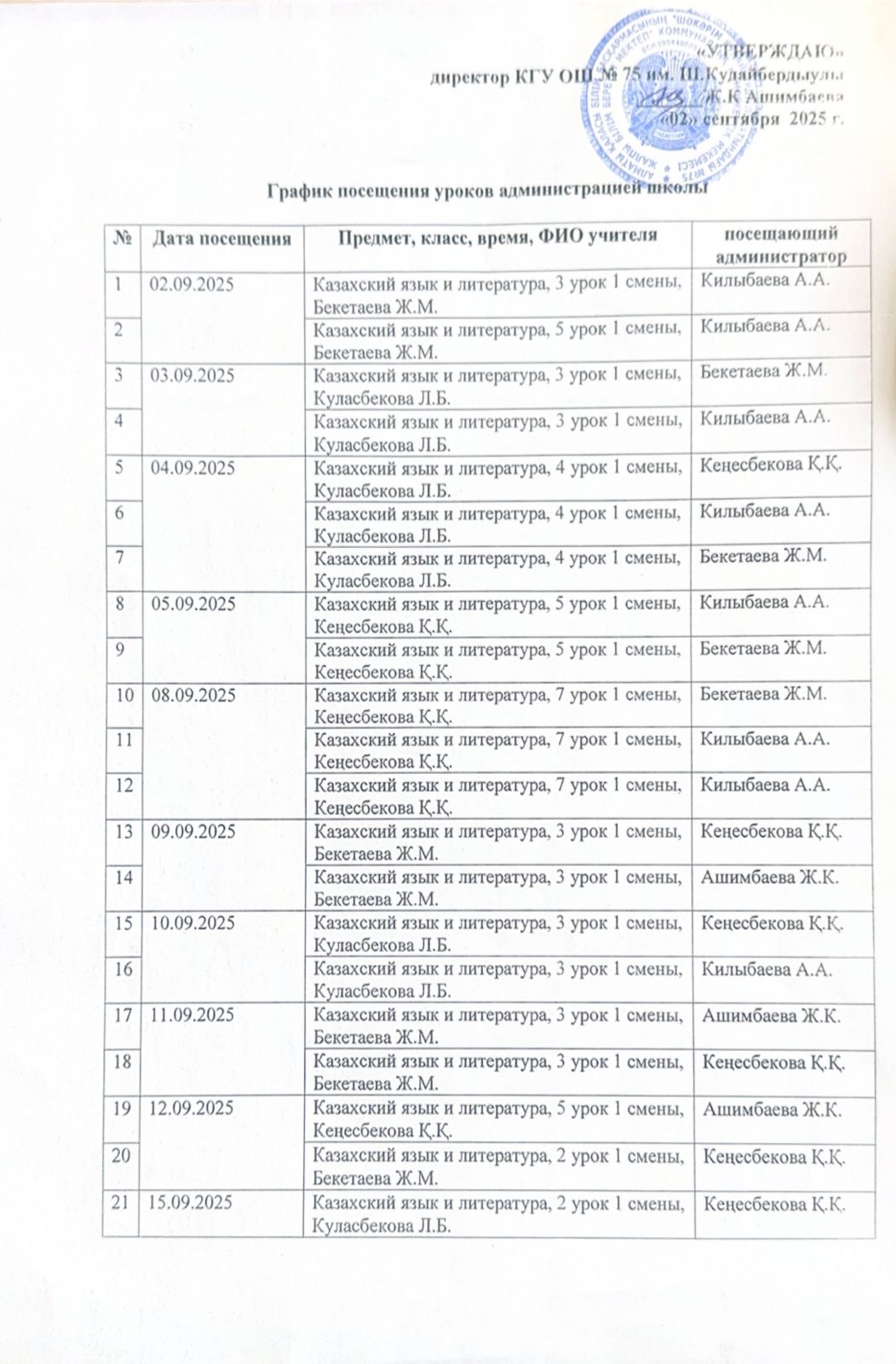 Мектеп әкімшілігінің келу кестесі./График посещения администрацией школы.