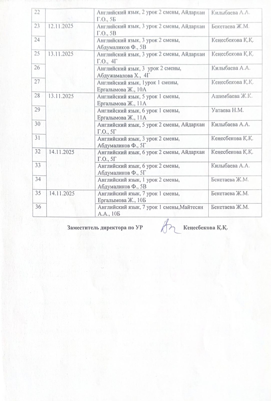 График посещения уроков администрацией школы. / Мектеп әкімшілігінің келу кестесі.