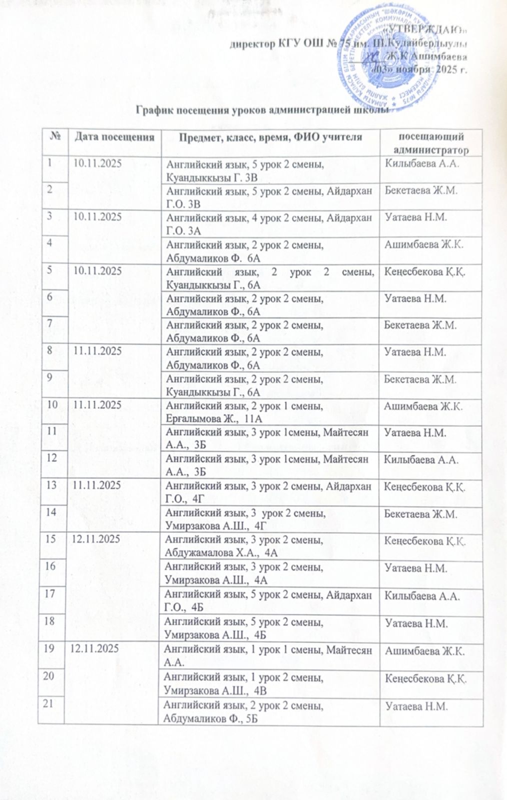 Мектеп әкімшілігінің келу кестесі./График посещения администрацией школы.