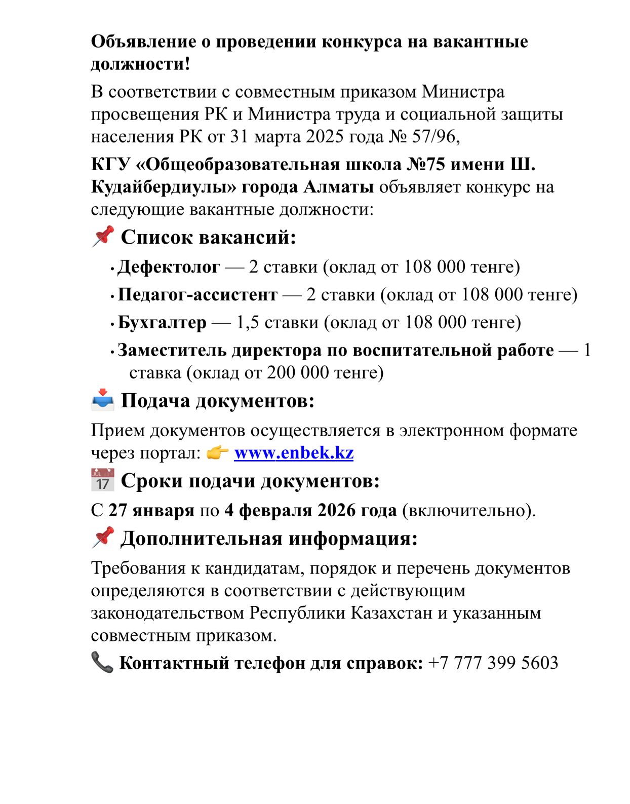 27 январь 2026 0 1 2 3 4 5 Бос лауазымдарға конкурс жариялау туралы хабарландыру! Объявление о проведении конкурса на вакантные должности!