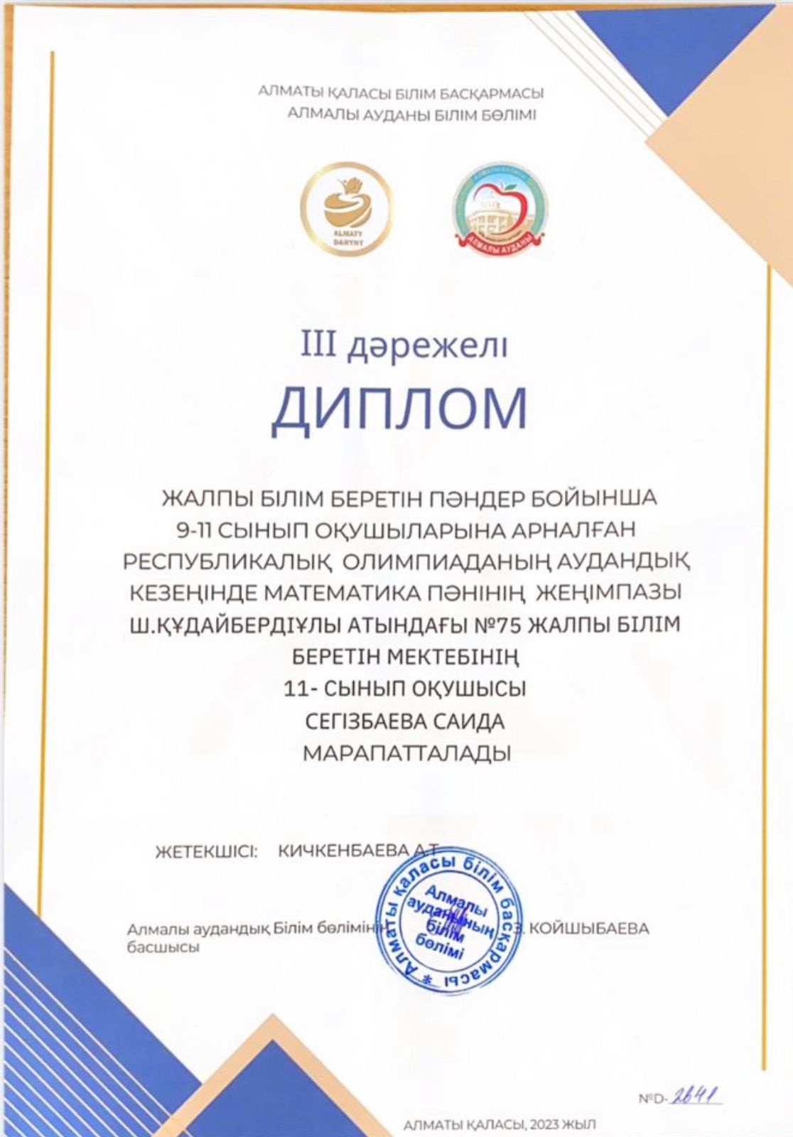 Жалпы білім беретін пәндер бойынша 9-11 сынып оқушыларына арналған Республикалық олимпиаданың аудандық кезеңінде математика пәнінің жеңімпазы Ш.Құдайбердіұлы атындағы 75 ЖББМ-нің 11-сынып оқушысы Сегизбаева Саида марапатталады.