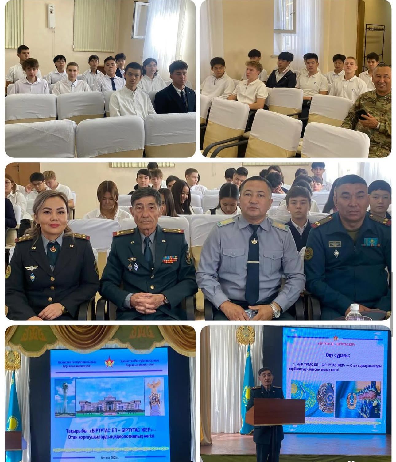 Управлением по делам обороны на тему:«БІРТҰТАС ЕЛ - БІРТҰТАС ЖЕР» - Отан қорғаушылардың идеологиялық негізі». Перед учениками вступили ветераны ВС РК и