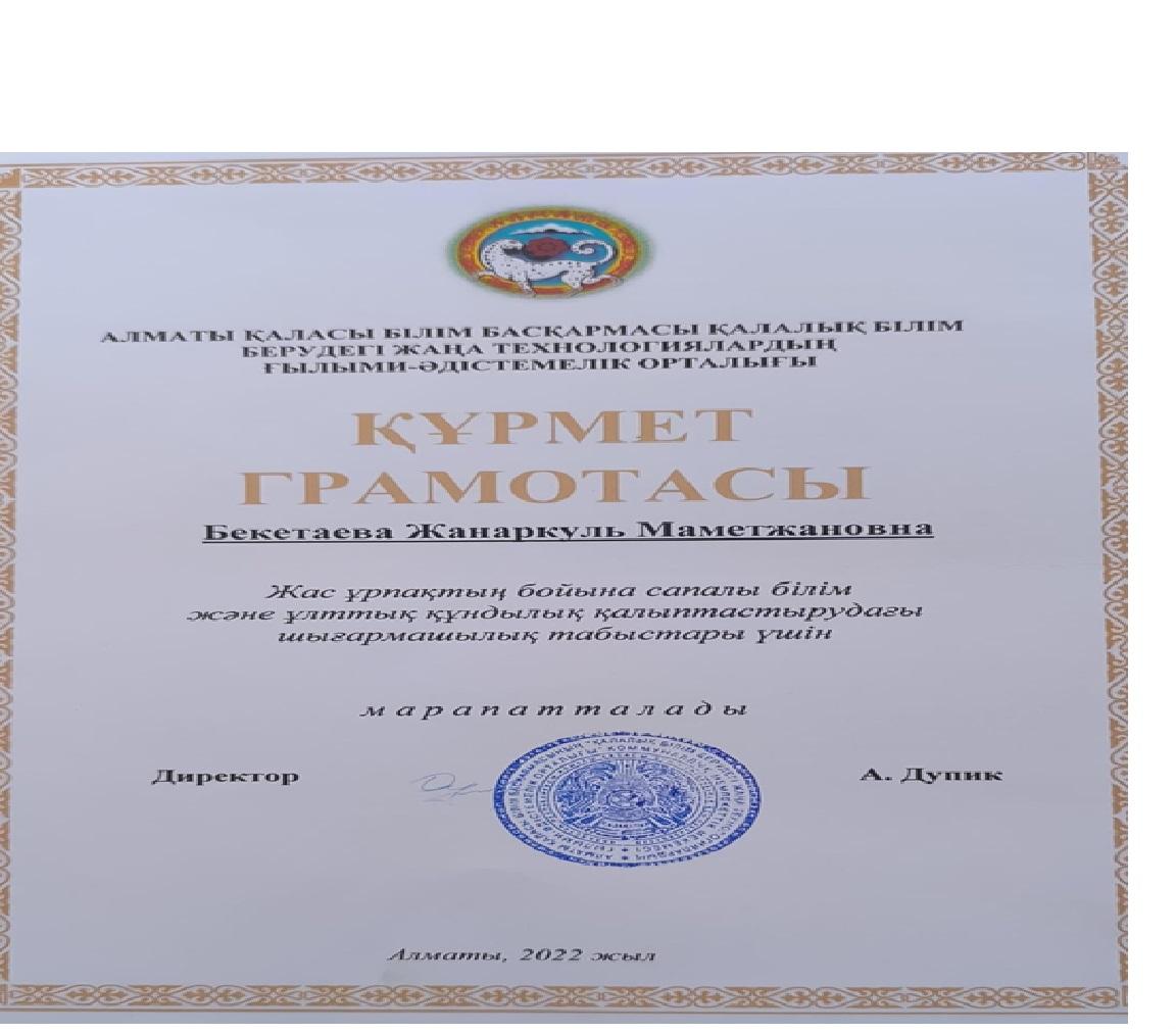 Жас ұрпақтың бойына сапалы білім және ұлттық құндылық қалыптастырудағы шығармашылыұ табыстары үшін Бекетаева Жанаркуль марапатталады!