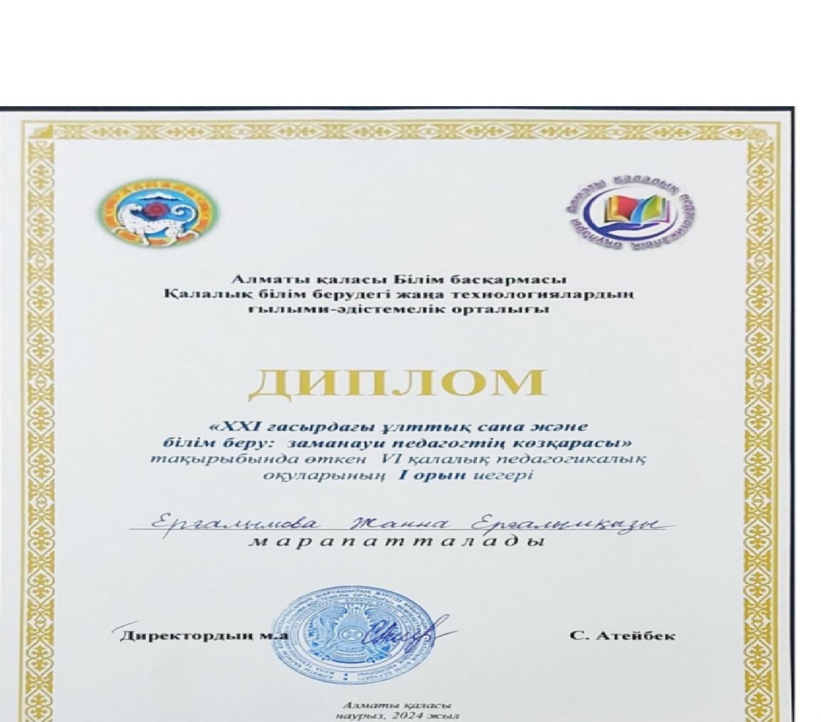 "ХХІ ғасырдағы ұлттық сана және білім беру: заманауи педагогтің көзқарасы" тақырыбында өткен 5-педагогикалық оқуларының 1-орын иегері Ерғалымова Жанна марапатталады!
