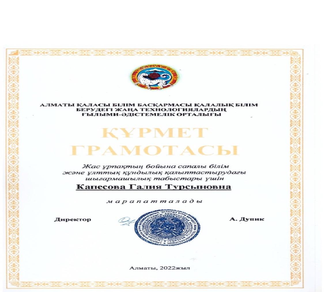 Жас ұрпақтың бойына сапалы білім және ұлттық құндылық қалыптастырудағы шығармашылыұ табыстары үшін Капесова Галия Турсыновна марапатталады!
