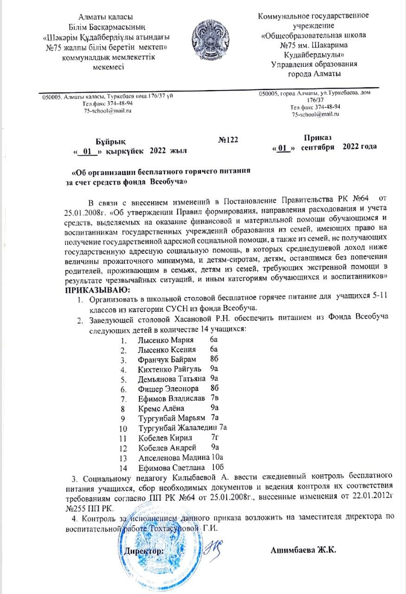 01 сентябрь 2022 0 1 2 3 4 5 Жалпыға бірдей білім беру қорының қаражаты есебінен тегін ыстық тамақты ұйымдастыру туралы / Об организации бесплатного горячего питания за счет средств фонда Всеобуча