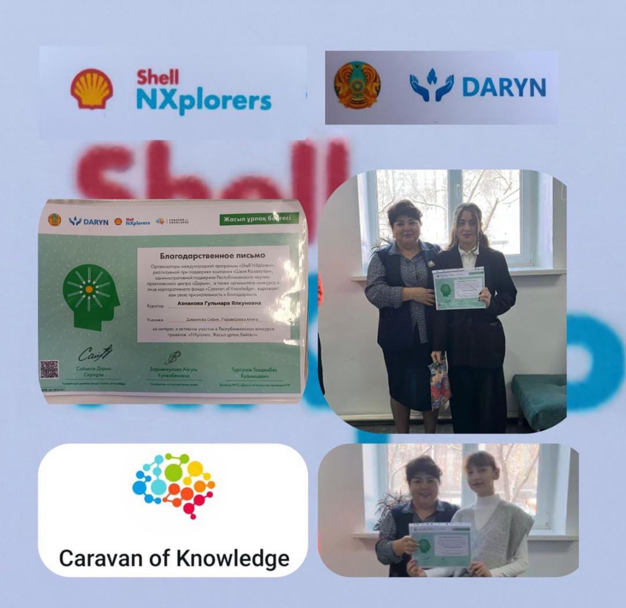 Мектебіміздің командасының CARVAN of KNOWLEDGE ұйымы мен SHELL NXplorers бағдарламасының бірлесіп ұйымдастырған республикалық «Жасыл ұрпақ» экологиялық жобасына қатысқанына мақтан тұтамыз.